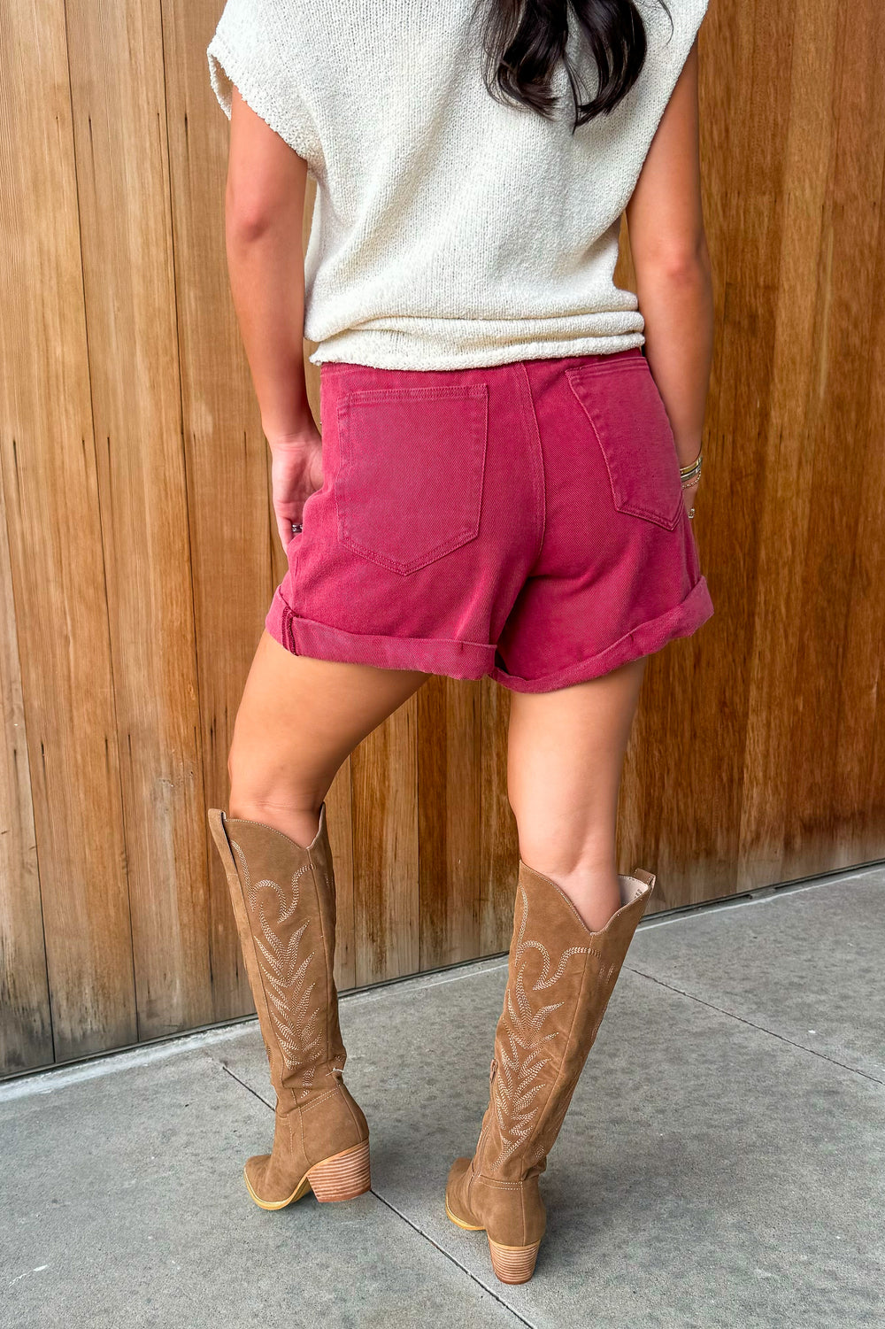 •  Lightweight woven material, high waist roll up hem, pleated detail, elastic waistband at back