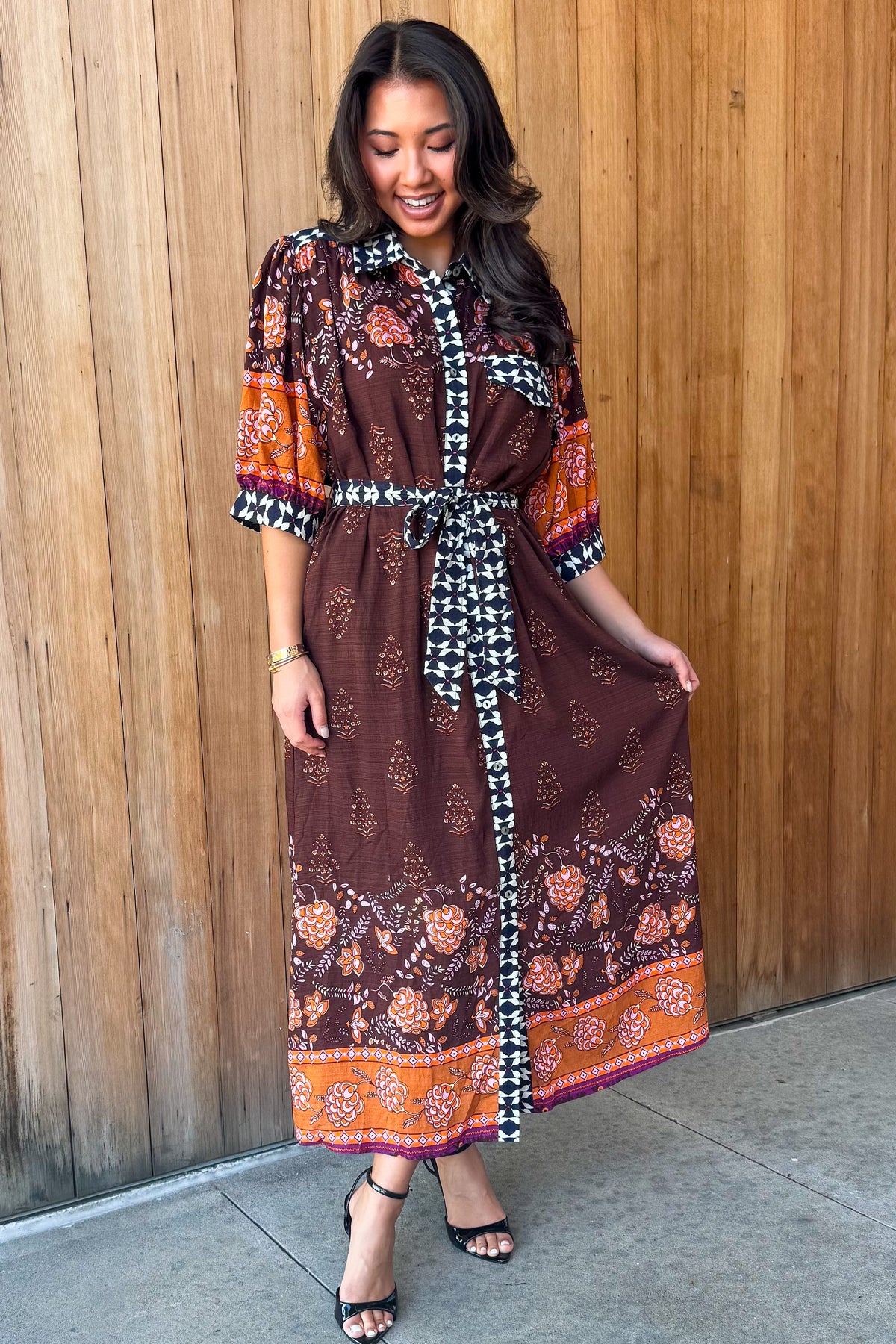 • Collared button down, puff sleeve, side pockets, lined, removable belt