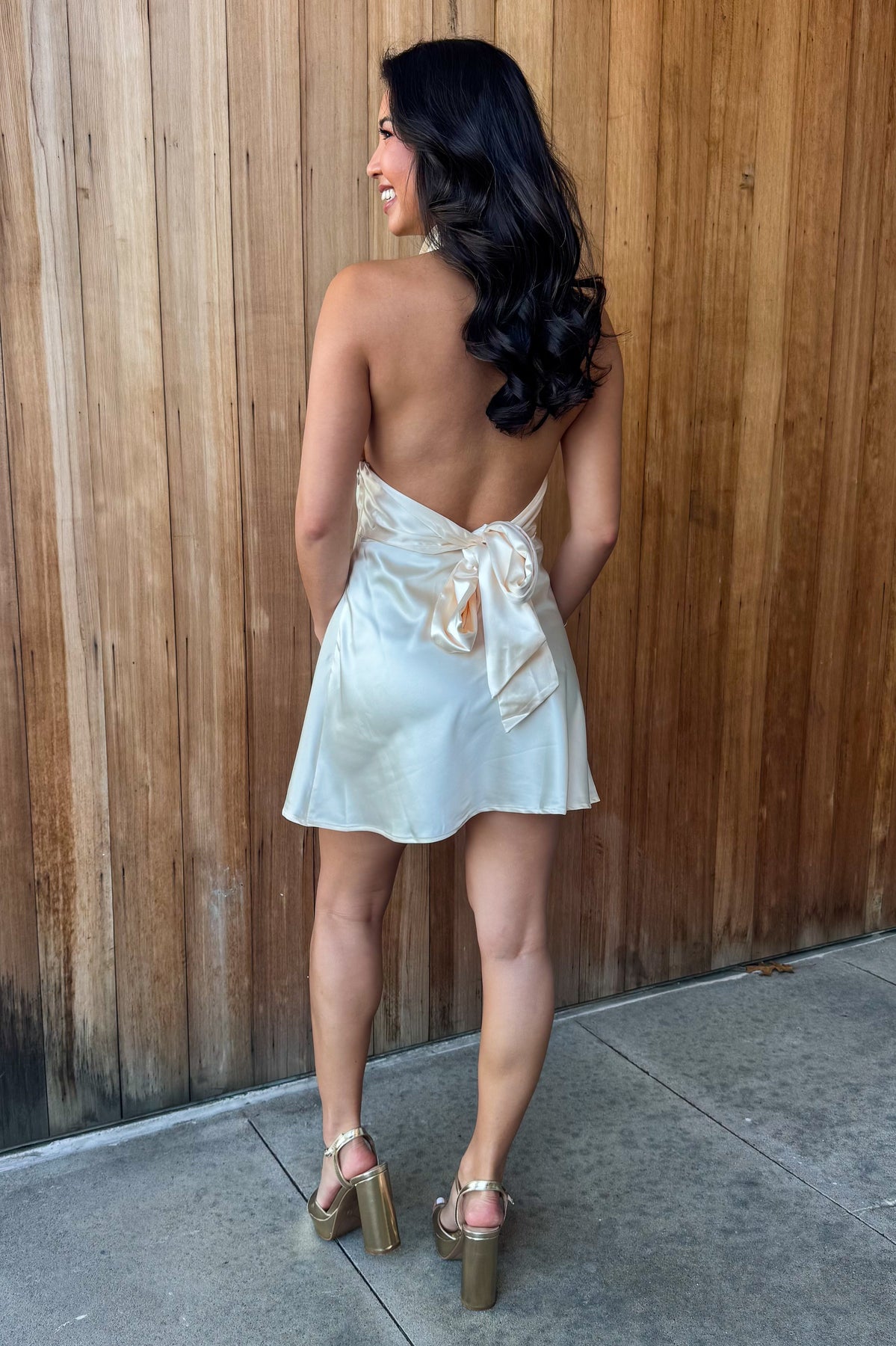• Halter neck with button closure, open back, tie detail, side zipper
