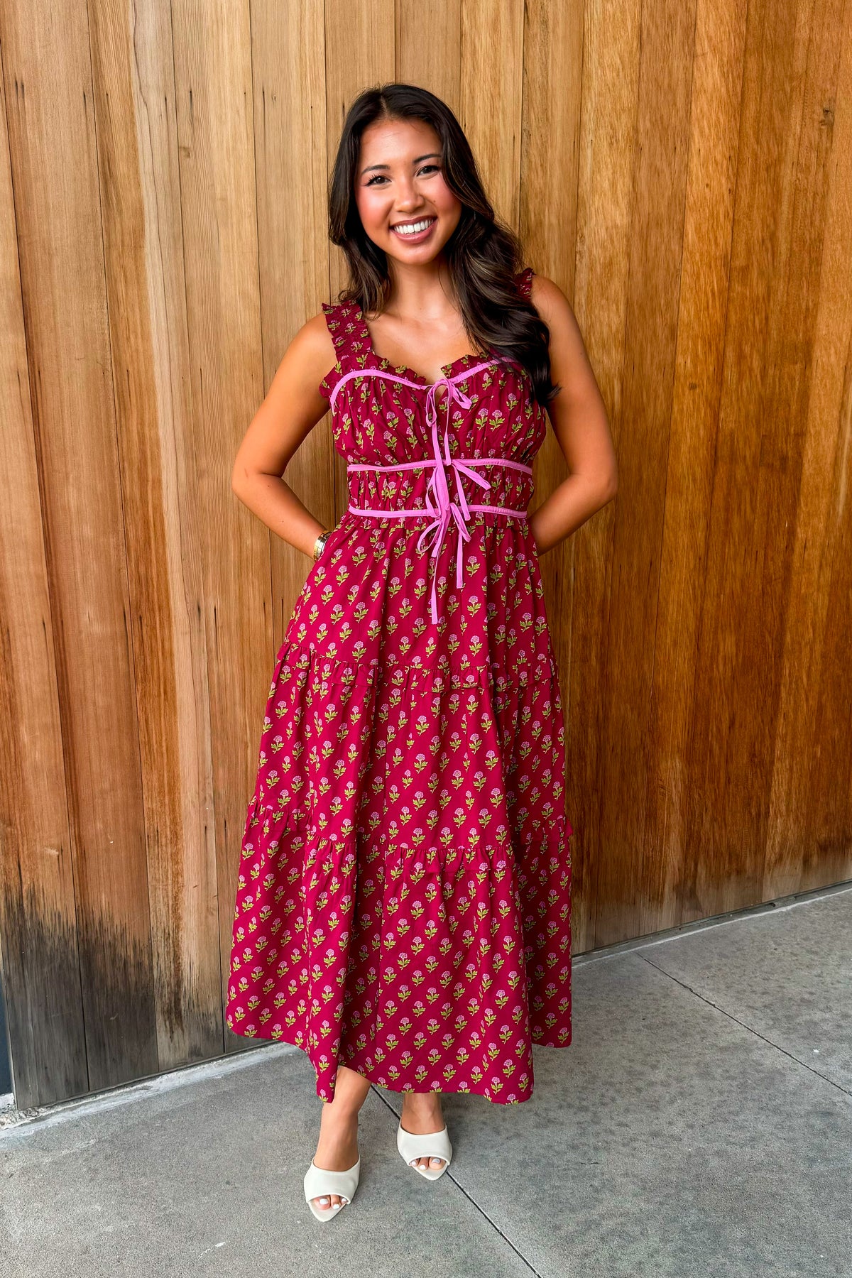 To be Loved Floral Tiered Midi Dress - Burgundy