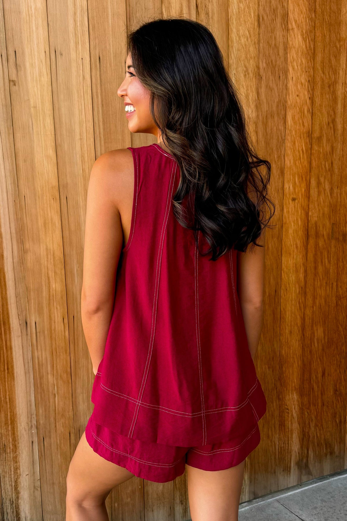 •  Lightweight, Sleeveless pull over top, contrast stitching, button keyhole closure at back